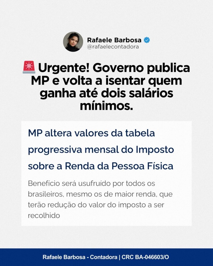 🚨 Empreendedores, fiquem atentos! A Medida Provisória 1.294/2025, publicada em 11 de abril, ampliou a faixa de isenção do Imposto de Renda para dois salários mínimos (R$ 3.036,00). A partir de maio, rendimentos de até R$ 2.428,80 estarão isentos, graças ao desconto simplificado de R$ 607,20. Essa mudança beneficia todos os contribuintes, reduzindo o valor do imposto a pagar. No entanto, pode impactar o planejamento financeiro das empresas e a retenção na fonte dos funcionários. A Receita Federal estima uma renúncia fiscal de R$ 3,29 bilhões em 2025, aumentando nos anos seguintes. O governo prevê um novo avanço com o PL 1.087/2025, que pode ampliar a isenção para rendimentos de até R$ 5 mil e reduzir impostos para aqueles que ganham até R$ 7 mil. Precisa declarar imposto de renda? Clique no link da bio e fale comigo. 💙✨ Fonte: Gov. #Economia #Finanças #Empreendedor #Empreendedorismo #EmpreendedorismoFeminino #MEI